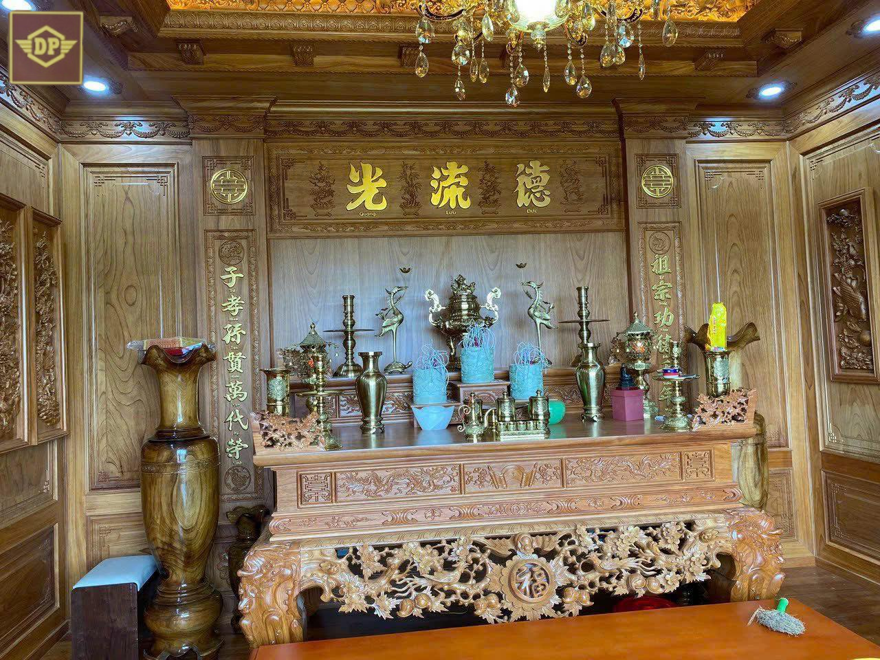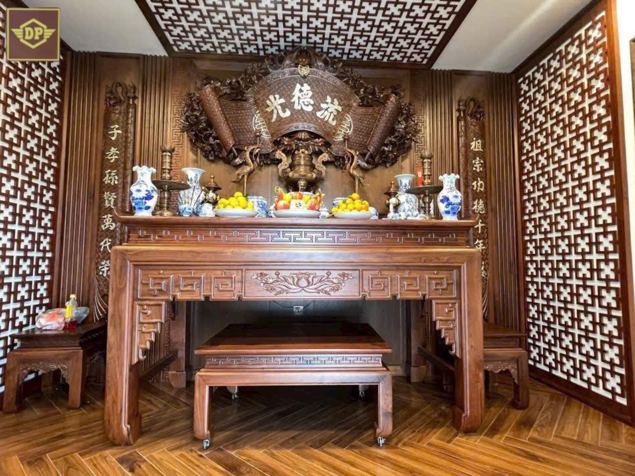 Bàn thờ gia tiên với thiết kế trang nghiêm, chất liệu gỗ bền đẹp, thể hiện lòng hiếu kính và gìn giữ nét văn hóa truyền thống thiêng liêng của người Việt.