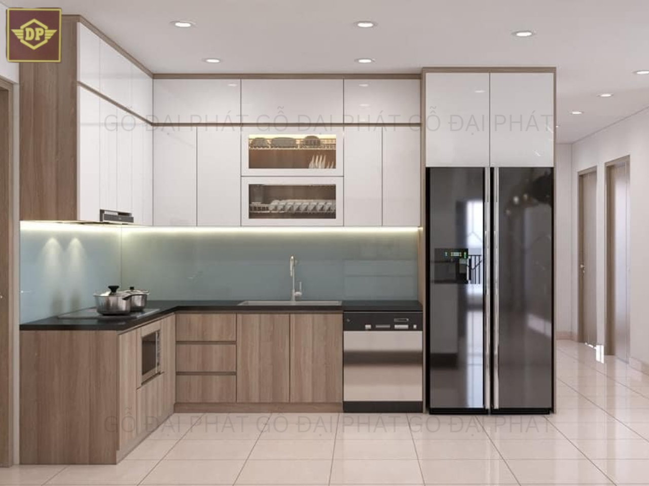 Ngày nay, nhiều mẫu tủ bếp gỗ chữ L còn tích hợp các thiết bị công nghệ hiện đại, từ đèn LED cho đến các thiết bị nhà thông minh. Điều này không chỉ làm cho không gian bếp trở nên hiện đại mà còn tăng tính tiện nghi cho người sử dụng.