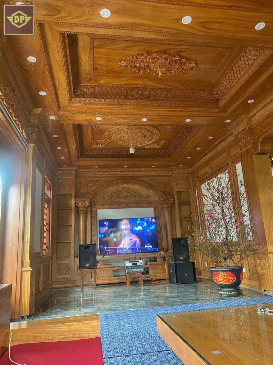 Trần gỗ phòng khách sang trọng, ấm cúng, đẳng cấp, với thiết kế tinh tế và chất liệu cao cấp, tạo không gian ấn tượng, bền vững và hài hòa với nội thất.